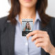 Uma fotografia, nome e título de crachá de um escritório corporativo ou de uma pequena empresa, simples e divertida em preto e branco. Adicione seu próprio logotipo para lhe dar sua marca. Um ponto e um padrão de faixa em preto e branco, bonitos, no topo, para um sotaque bonito, mas ainda profissional. Você pode mudar todo o texto e fundo para qualquer cor, e pode até mudar para outras fontes que ajustado melhor a sua marca. Você pode até mudar o padrão e as cores das linhas. Logotipo Preto Nome Branco E Título Crachá De Funcionário Comercial