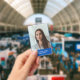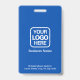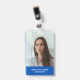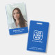 Crachá moderno, simples e profissional de funcionários empresariais em fundo azul com tipografia branca para corresponder ao seu logotipo personalizado, recursos de fotografia e título ou departamento profissional do funcionário na frente e no logotipo comercial e informações adicionais na parte traseira.