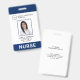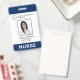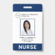 Crachá de foto médica em um layout vertical. Este design simples mas profissional apresenta uma borda azul marinho no topo e na parte inferior com branco no meio. O modelo é personalizado com seu logotipo, nome do hospital, nome do funcionário, título, departamento/local e ID do funcionário. A borda inferior tem "ENFERMEIRO" em letras grandes em negrito e pode ser alterada para qualquer título desejado. A parte traseira tem as informações de contato e instruções para retornar, se encontradas. Este design clássico é perfeito para uma enfermeira prática licenciada, enfermeira Viagem e muitos outros membros do funcionarios médico.