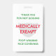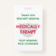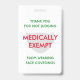 Crachá na moda branco, ISENTO MEDICAMENTE, mostrando MEDICAMENTE ISENTO em texto vermelho numa máscara de cinza pálida. O texto vermelho e verde diz "OBRIGADO POR NÃO JULGAR, ISENTO MEDICAMENTE DE VESTIR COBERTURAS ROSTO". Este texto é PERSONALIZÁVEL para que você possa substituí-lo pelo motivo da isenção (por exemplo, autismo, asma, deficiência oculta, etc.) ou você possa adicionar seu nome, se desejar. O fundo é BRANCO. Isso dá uma resposta excelente a todos os olhares do juízo e é uma boa maneira de mostrar que o distanciamento social é necessário.