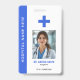 The front of the badge displays the medical facility name, logo, officer photo, officer name, and designation. The layout ensures patient-facing clarity and quick staff recognition.