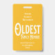 É divertido juntar-se a sua família e reconectar-se, compartilhar histórias e aprender sobre genealogia familiar. Também é divertido ter uma cerimônia de prêmios na reunião da Reunião da Família. Aqui está um botão de Prêmio amarelo e branco divertido para o membro mais antigo da família. Adicione seu nome de família e ano do evento. Awardees pode vestir seu crachá de honra em seus atuais e futuros Sindicatos da Família. Respeite seus anciãos com este prêmio divertido e moderno.