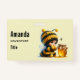 Nome de etiqueta com uma bela imagem. Uma garota com uma fantasia de abelha em crochê com uma abelha ao lado dela. Vendo um pote de mel.
