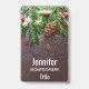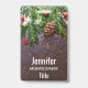 Uma plaquinha com uma fotografia rústica de uma mesa de madeira marrom com pinhas, agulhas de pinheiro, neve e enfeites de Natal. Festivo e encantador.
