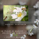 Etiqueta elegante Master Gardener com flores e abelhas. O verso apresenta uma citação de Audrey Hepburn sobre jardins.