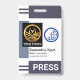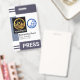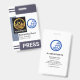 A capa apresenta uma coluna de listras cinza no topo e camadas inferiores do distintivo. Na parede esquerda do distintivo há um placard cinza claro especial que contém um modelo de foto. Aqui você pode colocar fotos com tamanho de 1.000 x 1.200 pixels. Essa coluna ajudará com fotos que têm fundo branco. Ao lado da foto há um logotipo de globo azul opcional que você pode usar. O logotipo é baseado em um conceito de design de "mundo quebrado". Isso é seguido pelo seu nome prestigiado, cargo e número de funcionário abaixo. Uma legenda "IMPRENSA" pode ser encontrada perto da base do distintivo, altere para atender às necessidades do seu serviço.