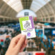 Um design moderno com ondas verdes e roxas fluindo de cima. Aqui está um modelo para enviar fotos com tamanho de 1.000 x 1.000 pixels. Logo abaixo, na coluna branca, está seu nome e cargo, juntamente com um logotipo global opcional. O logotipo representa um conceito de design de "mundo quebrado". Depois disso, vem o contato por e-mail perto da base do crachá.