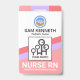 Um logotipo opcional de batimento cardíaco da silhueta da cidade fica no topo do crachá. Abaixo do logotipo está seu nome prestigioso e cargo. Perto do centro há um modelo de foto para carregar fotos até um tamanho de 1.000 x 1.000 pix. As cores ofuscantes atrás do modelo ajudarão se suas fotos tiverem um fundo branco. Na base está um comentário de legenda "NURSE RN", altere-o para atender às suas necessidades de serviço. O nome da organização está logo abaixo da legenda.