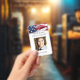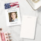 Crie crachás e etiquetas personalizados para funcionários usando um modelo moderno vertical fácil de personalizar com sua foto, logotipo da empresa e outras informações importantes. Design patriótico da bandeira americana dos EUA. Ótimo para militares e veteranos.