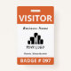 Crachá de visitante vertical com um simples design de cor laranja e branca. O VISITOR é escrito em letras brancas a negrito contra um fundo laranja para ser facilmente visível. Adicione seu nome comercial, logotipo e ramificação. Na parte inferior, o número do crachá.