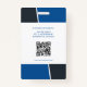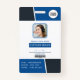Professional identification card with photo, logo, barcode, and qr code templates included. This modern design style has shades of blue; a navy blue, medium blue, and light blue with white base. Similar design on back, with business address, website address, and a website qr code.