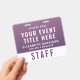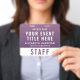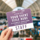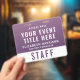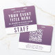 Elevate your event with this access pass badge, designed to bring a refined, modern, and slightly romantic touch to your event credentials. Featuring a rich deep plum purple to soft mauve gradient, this badge delivers a premium look while maintaining excellent readability. The clean layout highlights your event title, team member name, and role, with a bold “STAFF” (or VIP, CREW, VENDOR, etc.) designation for instant recognition. On the reverse, a large scannable QR code allows for seamless check-ins, schedules, digital credentials, or contact sharing -- making this badge both stylish and highly functional. Perfect for weddings and upscale celebrations, creative industry events, boutique brands, luxury experiences, trade shows, and conferences with a modern aesthetic.
