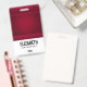 Crachá personalizado com fundo vermelho decorado com espirais elegantes e designs ornamentais ao longo das fronteiras.