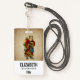 Crachá personalizado com um velho Pai Natal do Mundo Vintage. Papais noeis clássicos do velho mundo, vestindo seu famoso casaco vermelho e carregando um cheio de brinquedos. Estes Papais noeis antiquados, são magros e têm uma bengala para viajar pela terra dando brinquedos a todas as raparigas e rapazes. Fundo antigo do estilo de pergaminho.