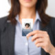 Sleek Navy Blue Personalized Employee Company ID Badges. It contains a customizable name and title, company address and additional information. A custom employee photo, image, picture, or photograph.
