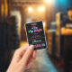 Festa de aniversário de Karaoke VIP Pass com um microfone fluorescente, tipografia neon-arco-íris, corações brilhantes e outros sotaques em fundo preto.