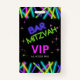 Uma borda de palitos brilhantes espalhados em uma série de cores néon brilhantes adiciona um elemento divertido a este convite estilo crachá Mitzvah Bar. Adicione os detalhes do evento ao contrário usando o modelo fornecido. Procure ID991 para ver o convite de coordenação e outros suprimentos de terceiros com este design colorido.