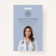 Um crachá mínimo de na moda de identificação de funcionário com tipografia clássica em um fundo azul pastel suave minimalista e limpo. O texto, o logotipo e o código QR podem ser facilmente personalizados para que um toque profissional corresponda à sua marca clínica e se misture bem em um ambiente médico profissional. Um design simples, minimalista e contemporâneo para um ambiente hospitalar, clínico ou médico.