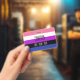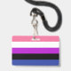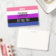 O fundo é a bandeira de orgulho para pessoas genderfluid. Este é um padrão listrado de rosa, branco, roxo, preto e azul. Há espaço para um nome personalizado e pronomes.