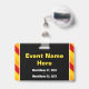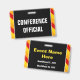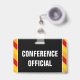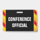 Este design de crachá de leitura contém a mensagem "OFICIAL DA CONFERÊNCIA". Apresenta também listras amarelas, vermelhas e cor de laranja, que chamam a atenção. A parte traseira apresenta um nome de evento personalizável e data(s) de evento. [~Z0000286]