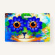 Crachá com a pintura animal de Louis Wain de olhos de flores de gato (1860-1939). Um gato arco-íris sorri muito. Flores azuis cobrir seus olhos. Um presente maravilhoso para amantes de gatos e arte inglesa.