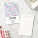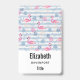 Crachá personalizado com um padrão com um clima divertido de verão. Flamingos rosa e abacaxis postos em um padrão listrado azul claro com folhas e corações ao redor.