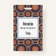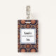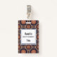 Crachá de nomes com um padrão repetitivo de elementos decorativos de ornamentados em forma de flor, estrela e sol.
