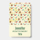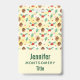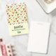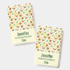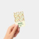 Uma etiqueta com um padrão natalino fofo apresentando pinhas e azevinho em um fundo de aquarela amarelo com pequenos círculos brancos espalhados.