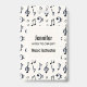 Um nome de etiqueta com um design musical temido. Um padrão com clave trivial, clave de baixo e outros símbolos musicais.