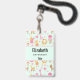Crachá personalizado com um padrão caprichoso que apresenta uma coleção de brinquedos e animais infantis encantadores.
