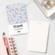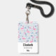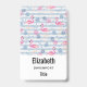 Crachá personalizado com um padrão com uma vibração de verão divertida. flamingos e abacaxis cor-de-rosa, colocados sobre um padrão listrado azul claro com folhas e corações ao redor.