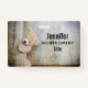 Um nome de etiqueta com uma fotografia de querido de um urso de pelúcia fofo, em pé por uma parede russa de madeira / pano de fundo.
