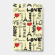 Design de texto de Paris para Dia de os namorados com formas vermelhas de coração, Torre Eiffel e decoração de lâmpadas de rua em fundo amarelo