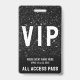 Este crachá de VIP apresenta um fundo ousado de brilho preto falso, perfeito para um show, festa de aniversário, despedida de solteira, desfile de moda e muito mais. Ao longo da parte superior, silhuetas de palmeiras se estendem pelo cenário cintilante, criando um clima divertido e glamoroso. Na parte inferior, um gradiente preto sólido ajuda o texto a se destacar claramente, garantindo que o nome do seu evento, data e “Passe de Acesso Total” sejam fáceis de ler na fonte sem serifa branca, limpa e ousada. “VIP” é colocado na parte superior no mesmo estilo simples para um visual elegante e moderno.