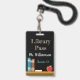 Um salão de biblioteca vertical com um quadro falho, alguns livros e uma maçã. Pode ser facilmente personalizado com o título de passe, o nome do professor e o número do quarto (ou o nome da escola). Esta passagem também está disponível na orientação horizontal. © ArianeC Ilustrações