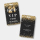 Um crachá VIP moderno, na moda e glamouroso para um aniversário de 21 anos. Um fundo preto decorado com confete de ouro falso. Com o texto: VIP. Personalize e adicione o nome e os detalhes da festa.