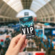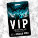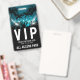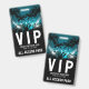 Este crachá de VIP apresenta um design arrojado em turquesa e preto, perfeito para um concerto ao ar livre ou uma festa com a vibe do Coachella. Ao longo da parte superior, silhuetas de palmeiras se estendem por um céu turquesa vibrante, definindo um tom de festival fresco e enérgico. A imagem desvanece para preto na parte inferior, onde o nome do evento, data e “All Access Pass” são exibidos em uma fonte sans serif branca, limpa e arrojada. “VIP” é apresentado na parte superior no mesmo estilo simples para uma aparência elegante e moderna.
