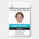 Crachá personalizado de uma Pastora feminina, embora possa ser personalizado para qualquer funcionário da igreja. Cada parte deste crachá de ID pode ser modificada de acordo com as suas necessidades. O nome da igreja, a fotografia do funcionarios, o título da pessoa e o endereço e o número de telefone podem ser personalizados. Há também um número de ID no verso que pode ser modificado ou excluído.