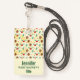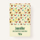 Um nome marcado com um lindo padrão de Natal com pinhas e holly em um fundo de aquarela amarela com pequenos círculos brancos espalhados ao redor.