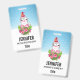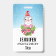Dê um nome ao crachá com um design bonitinho e caprichoso, com um adorável pinguim vestindo um chapéu de santa vermelho. Ficando atrás de um buquê de flores com canas doces listradas cor-de-rosa e branca. Um fundo de inverno nevado com flocos de neve caindo.