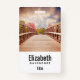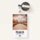 Crachá personalizado com fotografia cênica. Uma ponte de madeira em direção a um caminho rodeado por árvores florestais mudando de cor.