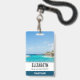 Crachá personalizado com uma bela foto com um resort de praia tropical. Bonito água azul e praia branca arenosa com aqueles cabanas que lhe dão uma vibração tranquila na ilha.