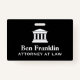 Procurador-legal personalizado Crachá do nome da câmara do tribunal. Crachás personalizados de advogado, advogado corporativo, funcionário, gerente, consultor jurídico, juiz, assistente, professor, consultor, secretário, colega, solicitor, mediador, advogado, advogado, advogado, advogado, notário, etc. Modelo profissional com título ou nome da empresa. Faça o seu próprio com um nome personalizado e uma função formal de trabalho. Design de tipografia moderna elegante com logotipo preto e quadrado branco. Útil para funcionários de escritório, colegas, recepcionistas, farmácia, pessoal, funcionarios, etc. Adicione seu próprio logotipo opcionalmente. A cor de fundo pode ser alterada.