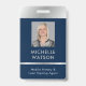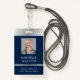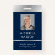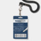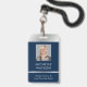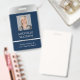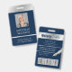 Crachá moderno de identificação de fotos em marinho e prata com espaço para uma foto de perfil personalizada, título de trabalho, detalhes de contato, serviços e código de barras. Este elegante crachá de nome de funcionário apresenta fundo azul escuro e efeitos cromáticos falsos com texto totalmente editável e uma foto.