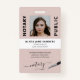 Modern typography professional legal certified notary attorney at law consultant custom personalized dusty rose black ID badge with elegant calligraphy script and pen logo. +++++++++++ Easy to personalize with your photo, your details, and bar code on both sides.