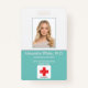 Foto para ID de Funcionário Hospital Médico aqua ou turquesa e Crachá branco. Um simples profissional de saúde moderno crachá de foto de identificação profissional projetado profissionalmente como um modelo on-line para um estabelecimento de saúde ou hospital com capacidade de substituir a foto do funcionarios, o modelo de logotipo, o nome do funcionário e o título profissional. No verso, adicione mais informações, como endereço de devolução, código de bar e número de ID do funcionário. Excelente para os logotipos redondos da empresa.