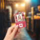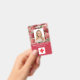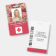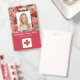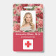 Crachá de profissional médico do hospital para identificação de fotos. Um profissional médico simples moderno, crachá de foto com identificação vermelha, projetado profissionalmente como um modelo on-line para um estabelecimento de saúde ou hospital, com capacidade de substituir a foto do funcionarios, o modelo de logotipo, o nome do funcionário e o título profissional. O design bonito, feminino, feminino apresenta um bloco de cor vermelho e rosas vermelhas cor-de-rosa vintage em fundo rosa dourado. No verso, adicione mais informações, como endereço de devolução, código de bar e número de ID do funcionário. Excelente para os logotipos redondos da empresa.