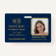 Personalize e personalize esse crachá moderno de funcionários projetado com um padrão moderno de mini quadrados azuis e um monograma simples e minimalista Dourado com duas letras em fundo azul marinho. Crachá profissional para os seus funcionários e uma oportunidade surpreendente de marca e marketing para a sua empresa.