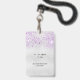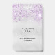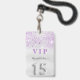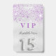 Um crachá moderno, na moda e glamouroso para a Quinceañera, festa de aniversário de uma menina. Um fundo com aspecto de prata falsa, com brilho falsa de cor lavanda. O nome é escrito com um moderno estilo escrito à mão. Com o texto: VIP Número 15 é escrito com uma fonte de estilo de balão, script. Voltar: data da festa e endereço do local.