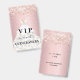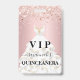 Um emblema moderno, elegante e glamouroso para uma festa de Quinceañera, aniversário de 15 anos. Um fundo gradiente rosa rubor com poeira brilhante dourada rosa. Com o texto: VIP. Personalize e adicione nome, idade, data. O nome é escrito com um estilo de letra manuscrita moderna com floreios.